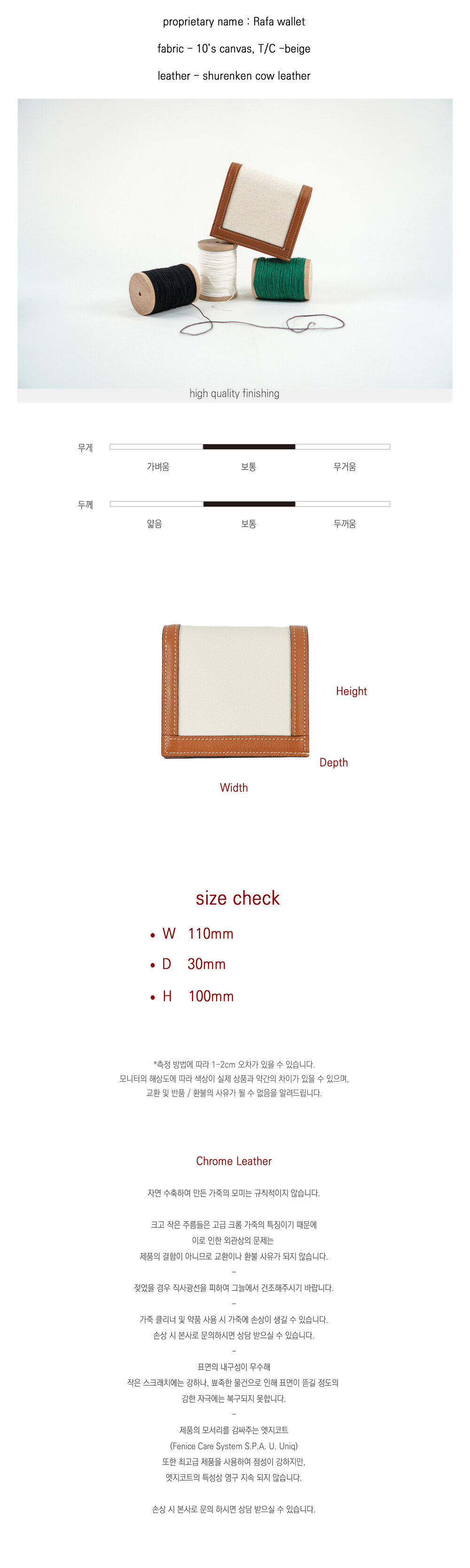 슈렁큰 소가죽으로 제작되었으며 1개의 제품은 1명의 제작자가 처음부터 마무리까지 제작하는 웰메이드 제품입니다.