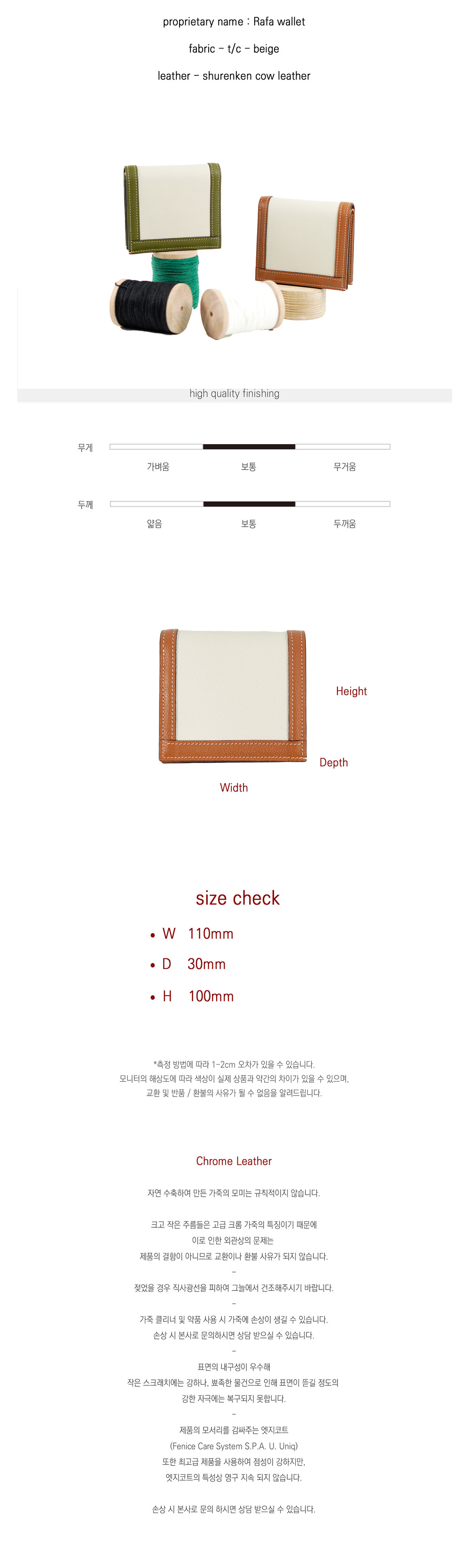 슈렁큰 소가죽으로 제작되었으며 1개의 제품은 1명의 제작자가 처음부터 마무리까지 제작하는 웰메이드 제품입니다.