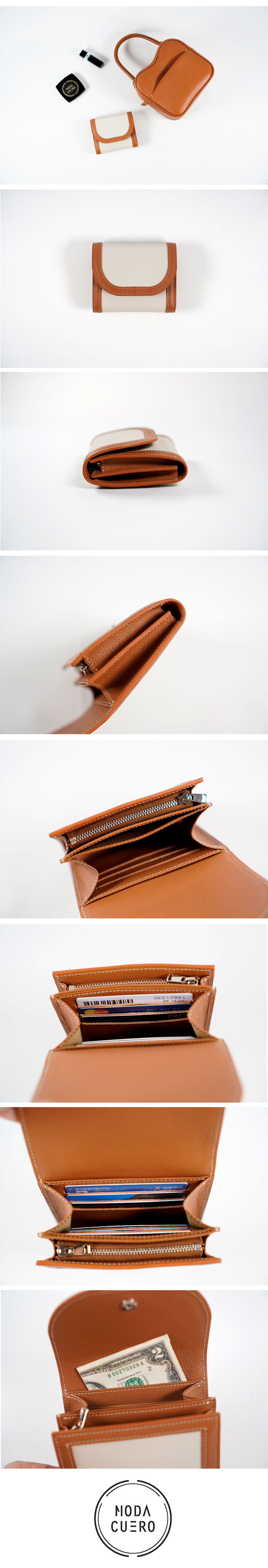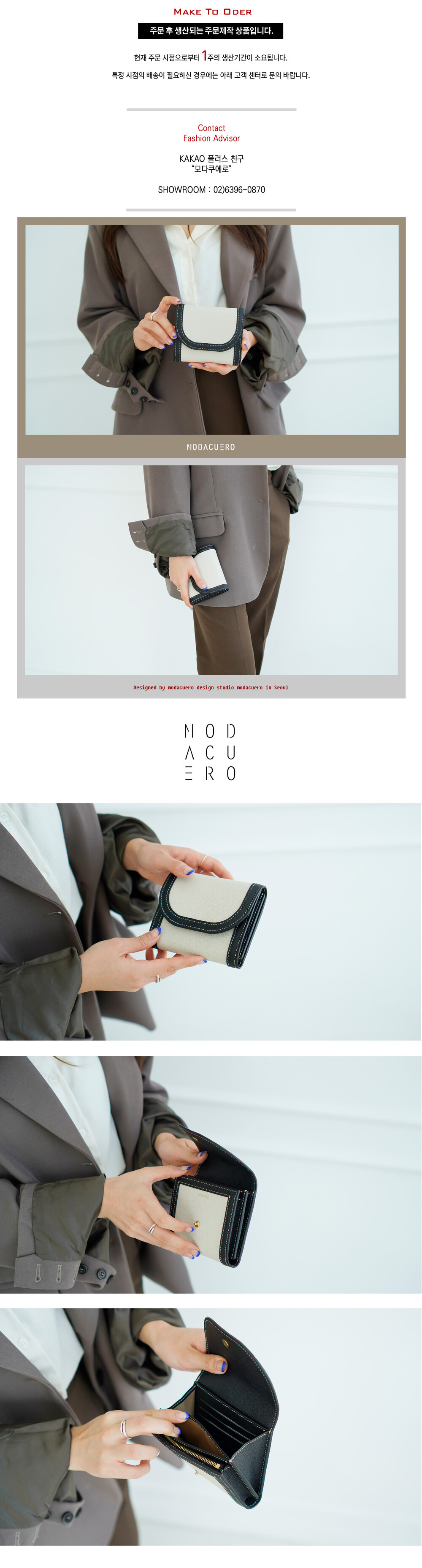 12*9.5*3cm의 반지갑으로 총 6장의 카드 수납공간과 2칸의 히든 수납공간, 그리고 다양한 수납이 가능한 지퍼칸이 있습니다.